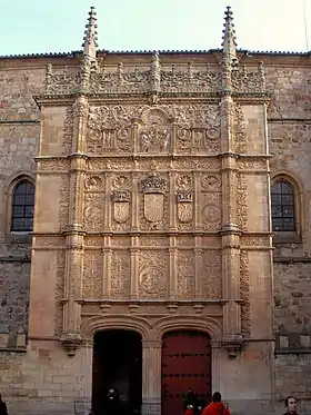 La fachada de la Universidad de Salamanca data de 1529 y pertenece al estilo plateresco, que se desarrolló en los primeros 30 años del siglo XVI. Se caracteriza por una minuciosa y abundante decoración. Para muchos, esta fachada es la obra maestra del plateresco español.