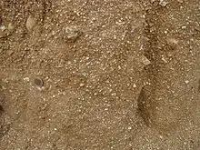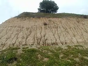 - Arena tosquiza: Material de naturaleza arenosa, con un contenido en finos variable entre el 25 y el 40%.[2] El color característico es marrón anaranjado claro a marrón verdoso claro en función del tipo de minerales de la arcilla que contenga. La compacidad varía de medianamente densa en niveles superficiales, a densa o muy densa a mayor profundidad. Representan un escalón más distal que la arena de miga en el contexto de abanicos aluviales, presentando abundantes cambios de facies a arenas de miga y toscos. Los contenidos de sulfatos en estos suelos son también despreciables. La permeabilidad es relativamente baja, dado su elevado contenido en finos y su alta compacidad.