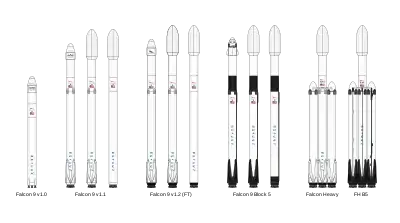 La primera versión del cohete Falcon 9 v1.0 se lanzó cinco veces desde junio de 2010 hasta marzo de 2013, su sucesor Falcon 9 v1.1 15 veces desde septiembre de 2013 hasta enero de 2016, y la última actualización Falcon 9 Full Thrust 120 veces desde diciembre de 2015 hasta el presente, 26 de los cuales han utilizado una primera etapa reutilizada. Falcon Heavy se lanzó por primera vez el 6 de febrero de 2018, incorporando dos primeras etapas restauradas como propulsores laterales; luego, lo hizo nuevamente en abril y junio de 2019, en este último, se reutilizaron los propulsores laterales del vuelo anterior. El último propulsor "Block 4" producido se lanzó en abril de 2018, y el primer Block 5, en mayo de ese año. Mientras que los propulsores Block 4 solo se usaron como máximo dos veces y requirieron varios meses de renovación, las versiones Block 5 están diseñadas para sostener 10 vuelos con sólo inspecciones, posiblemente con un tiempo de retorno al servicio de 24 horas.[27]