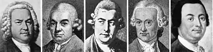 | Johann Christoph Bach (1642–1703) | Johann Michael Bach (1648–1694) | Johann Ambrosius Bach (1645–1695) | Maria Elisabetha Lämmerhirt (1644–1694) | Johann Christoph Bach (1645–1693) | |||||||||||||||||||||||||||||||||||||||||||||||||||||||||||||||||||||||||||||
