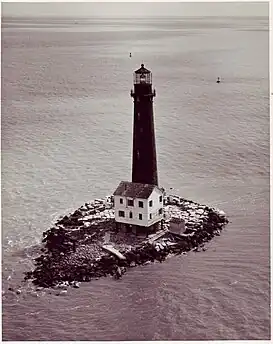El primer faro en Sand Island fue construido por Winslow Lewis en 1837, tenía 55 pies (16,8 m) de altura y la estructura fue terminada en 1839. La iluminación fue proporcionada por 14 lámparas en reflectores de 16 pulgadas y una lente de primer orden, conocida como lámpara Lewis, que era una versión mal diseñada, o lámpara estilo Argand.[3] Lewis disfrutó de un monopolio a través de su relación con Stephen Pleasonton que duró hasta 1853.[4]