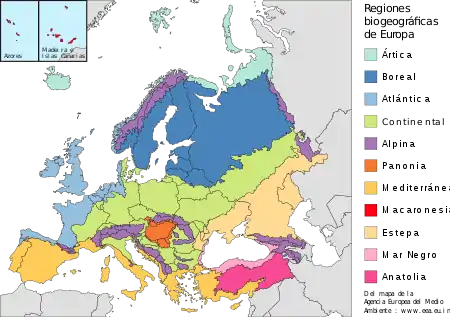 La glaciación durante la última edad de hielo y la presencia del hombre afectaron la distribución de la fauna europea. En cuanto a los animales, en muchas partes de Europa la mayoría de los animales grandes y de las especies depredadoras superiores han sido cazados hasta la extinción. El mamut lanudo se extinguió antes del final del período Neolítico. Las especies de árboles se extienden hacia afuera de los refugios durante los períodos interglaciales, pero en patrones variados, con diferentes árboles dominando en diferentes períodos.[1] Los insectos, por el contrario, cambiaron sus rangos con el clima, manteniendo la consistencia de las especies en su mayor parte a lo largo del período (Coope 1994). Su alto grado de movilidad les permitió trasladarse mientras los glaciares avanzaban o retrocedían, manteniendo un hábitat constante a pesar de las oscilaciones climáticas. Los mamíferos recolonizaron los territorios a diferentes velocidades. Los osos pardos, por ejemplo, se trasladaron rápidamente de los refugios según los glaciares iban retrocediendo, convirtiéndose en uno de los primeros mamíferos grandes en recolonizar la tierra. El último período glacial terminó hace unos 10.000 años, dando como resultado la distribución actual de ecorregiones.