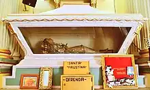 Casi una década después, en 1812, el cuerpo de la santa fue depositado en la urna que lo custodia actualmente, acontecimiento certificado ante notario. Aquejado de una enfermedad, el conde terminaría donando los restos de la mártir y el vaso de sangre a la iglesia del Convento de San Diego de Guanajuato, que a comienzos del siglo xix fungía como templo parroquial, instalándose la urna en la capilla de una de las torres.[6][8]: 20 [nota 2] Finalmente, en 1826 el cuerpo pasaría a ser venerado en la Basílica colegiata de Nuestra Señora de Guanajuato, concretamente en la capilla donde se encuentra sepultado el sacerdote y militar Celedonio Domeco de Jarauta, cuyo altar fue realizado por el arquitecto Eduardo Tresguerras ese mismo año,[2][9]: 24 [nota 3] si bien en 1907, a raíz del patronato canónico de la Virgen de Guanajuato, las reliquias serían conducidas a la capilla mayor y dispuestas directamente debajo del sagrario, todo ello bajo la supervisión del notario público.[5][6][10] La gran devoción que la santa despertó en los fieles llevaría a que la urna fuese retirada de la capilla mayor e instalada en el lado de la epístola del tramo inmediato anterior al crucero, lugar que ocupa en la actualidad.