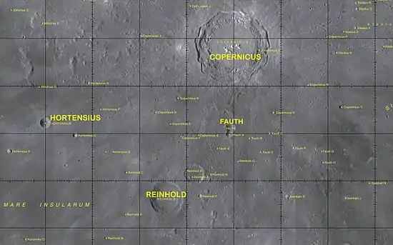 Esta formación está compuesta por los cráteres fusionados Fauth y el ligeramente más pequeño Fauth A, que con un radio de 9,6 km muestra una serie de incisiones en su lado sur. Fauth es muy probablemente un cráter secundario que fue creado por la formación de Copérnico.