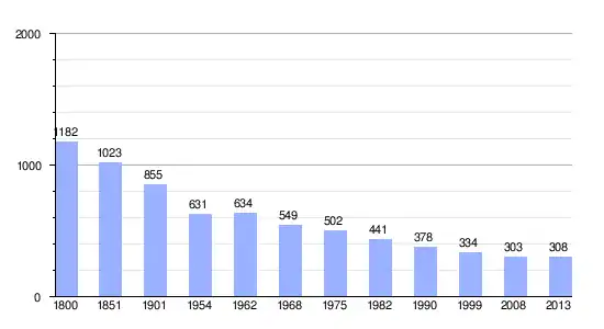 Los datos demográficos contemplados en este gráfico de la comuna de Faverolles[4] se han cogido de 1800 a 1999 de la página francesa EHESS/Cassini, y los demás datos de la página del INSEE.[5]