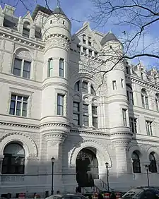 El edificio es un ejemplo de arquitectura de estilo neorrománico y es un componente destacado del complejo del Centro Municipal. La parte original del edificio tiene cuatro pisos y la adición de 1933, siete. El exterior se ha mantenido prácticamente sin cambios. La estructura central tiene formas simples y fuertes con poderosos arcos que dominan el primer piso. Las buhardillas elaboradas, el techo de hierro con cresta, los techos inclinados y una torre le dan al edificio una cualidad pintoresca.[3]