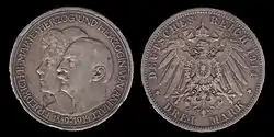 Reverso (en alemán): DEUTSCHES REICH, 1914, DREI MARK, en español: "Imperio alemán, 1914, tres marcos".
