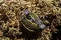 Esta especie es predominantemente de color azul oscuro con un patrón de líneas amarillas longitudinales. Las líneas amarillas se ramifican y curvan, formando a veces una red en el centro del dorso. En el borde del manto hay una línea amarilla doble con una serie de manchas alargadas de color azul brillante o bien una línea azul rota entre las manchas y el siguiente conjunto de líneas que cubren el dorso. Puede que haya también una serie de manchas blancas dentro de las marcas azules. El rinóforo es azul traslúcido con pigmento blanco opaco en la base y una línea en el dorso, mientras que las puntas son azules. Las branquias también son de color azul traslúcido con un línea central de color blanco opaco en las caras interiores y exteriores. El cuerpo llega a alcanzar una longitud de 40 mm.[4][6]
