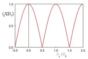 Préstese atención a que la corriente crítica es periódica en el flujo aplicado con período Φ₀. La dependencia de la corriente crítica del flujo aplicado se muestra en la Fig. 6. Tiene un fuerte parecido con el patrón de interferencias generado por un rayo láser detrás de una rejilla doble. En la práctica la corriente crítica no es cero para valores medio enteros del flujo cuántico del flujo aplicado. Esto se debe al hecho de que la propia inductancia del bucle no puede ser despreciada.[12]