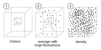2. Si el número de partículas es algo mayor es que hay algunas partículas dentro de la caja. Se define pues una media, pero el número real de partículas tiene relativamente grandes fluctuaciones alrededor de esta media.