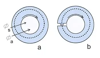 En la Fig. 3 se presentan dos situaciones de anillos superconductores en un campo magnético externo. En un caso es un anillo de paredes gruesas y en el otro el anillo también tiene paredes gruesas pero esto se interrumpe por una conexión débil. En el último nos encontraremos con las famosas relaciones de Josephson. En ambos casos se considera el bucle dentro del material. En general una corriente en circulación por superconductores fluirá en el material. El flujo magnético total en el flujo es la suma de los flujos aplicados Φa y el flujo inducido Φs, inducido por la corriente en circulación