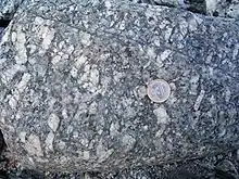 Fenocristales de feldespato en un bloque de granito. Obsérvese la moneda para comparar el tamaño