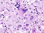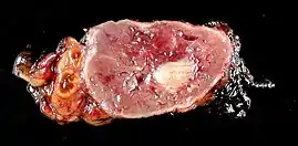 ![]() Histopatología de un feocromocitoma con necrosis coagulativa con inmunotinción | ||