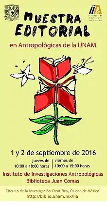 | En el año 2016, no se pudo organizar la FLA como se acostumbraba, sin embargo la Biblioteca Juan Comas impulsó la realización de una muestra editorial, logrando cumplir su objetivo: acercar al personal académico del instituto a los materiales bibliográficos con la temática de la antropología y ciencias sociales para su selección y posterior adquisición, por parte de la Biblioteca (Fecha 1 y 2 de septiembre) | ![]() En 2016 la feria del libro antropológico no se llevó a cabo, sin embargo hubo una muestra editorial |