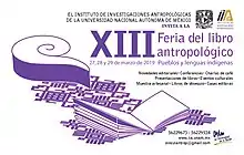 | En el 2019 se organizó la XIII edición de la FLA, en esta ocasión se le dio una temática a la Feria "Pueblos y lenguas indígenas", del mismo modo al igual que sus anteriores ediciones se llevó a cabo un programa académico y cultural además de la venta de artesanías (Fecha 27 al 29 de marzo) | ![]() Cartel promocional de la octava Feria del Libro Antropológico de 2019 |