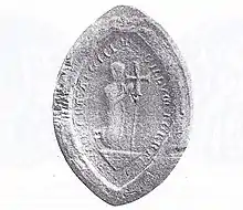 ![]() Sello biojival de 1244 que representa al abad arrodillado frente a una cruz | ||