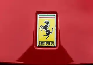 El famoso símbolo de Ferrari es un caballo negro rampante sobre un fondo amarillo y con los colores de la bandera de Italia en posición horizontal en la parte superior, normalmente con las letras SF de Scuderia Ferrari/San Fiorano, cuyo fondo tiene forma de escudo heráldico. En el caso de los coches de calle, tiene forma rectangular.