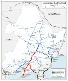 | Línea Jingbin | Línea Kyōhin | Xinjing–Harbin | 242 | Antiguo ferrocarril del Norte de Manchuria | Ahora parte del ferrocarril de Jingha |