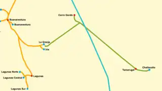 ![]() Trazado del Ferrocarril de Cerro Gordo (en color verde lima) hacia 1930. Las estaciones están marcadas en rojo y las oficinas salitreras y yacimientos mineros en celeste. | ||