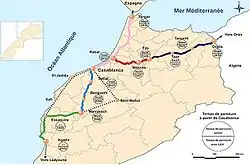 - Sáhara Occidental: a través de la extensión de red propuesta desde Marrákesh a través de Egleimín hasta El Aaiún conectaría Marruecos con el Sahara Occidental. Actualmente, la empresa filial de ONCF, Supratours, opera rutas de autobús desde Marrákesh al Sahara Occidental, como Tan-Tan o El Aaiún. Marruecos reclama el Sahara Occidental como parte de Marruecos y, por lo tanto, lo considera como rutas nacionales.