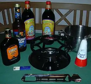 En la preparación se suele verter ron ya previamente caliente sobre el cono en llamas, a veces se emplean rones de mayor graduación, como el stroh para poder encender el cono en las primeras fases. El vertido del ron es una labor peligrosa que se debe hacer con extremo cuidado y con el local a oscuras, para poder detectar fácilmente las llamas ocasionales. El quemado del cono proporciona un ambiente mágico, que favorece la degustación del ponche.