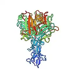 La fibra adenoviral se encuentra en los adenovirus, virus no encapsulados con cápside proteica icosaédrica y ADN bicatenario de entre 34 y 38 kilobases.[4] Estos virus tienen 13 proteínas estructurales, una de las cuales es la proteína IV. Estas fibras adenovirales (en cada virión hay en total 12) se proyectan hacia el exterior desde la cápside del virus, a la cual se unen gracias a su asociación con otras proteínas llamadas bases pentonas (proteína III).[5]