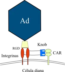 - La primera fase es la asociación del knob[9] de la fibra al receptor primario del virus. Según el tipo de adenovirus humano, el receptor puede ser uno u otro. Predominantemente encontramos CAR, una proteína transmembrana presente en la zonula occludens de células epiteliales. Asimismo podemos encontrar CD46, DSG-2 y ácido siálico.[10]