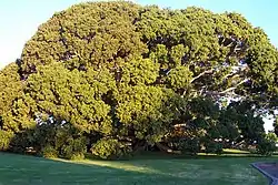 ![]() Ejemplar de Ficus obliqua ubicado en Mick Ryan Park, Milton, Nueva Gales del Sur. La proyección de su copa alcanza 38 m de ancho. | ||