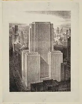 Los pisos superiores están revestidos de piedra caliza con ventanas agrupadas verticalmente y empotradas para enfatizar la altura del edificio. La torre rectangular de 45 pisos está centrada en la base y apuntalada por una torre más corta de 22 pisos en cada una de sus cuatro esquinas.[3]