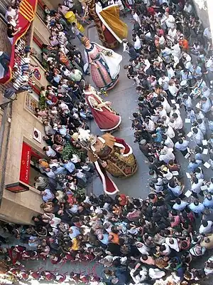 Cuando termina la última danza, la comitiva se dirige al compás de la música hacia al Ayuntamiento, donde vuelven a bailar los gigantes para terminar la fiesta. Pero esta vez, al ser el último día, se alarga mucho, donde cuatro portadores, uno por cada gigante, bailan sin parar hasta que uno de ellos se cansa, dando por finalizados los actos tradicionales más concurridos de la Fiesta Mayor.