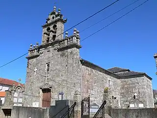 La iglesia, situada en el lugar de Filgueira, apenas guarda recuerdos de sus viejos tiempos, ya que está desvirtuada por la funcionalidad de los templos rurales ampliados en sus dos últimas centurias. La fachada posee una fuerte línea de cornisa de la que sobresale el campanario de doble arco coronado con pináculos.