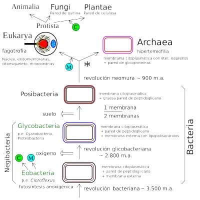 - Neomura (Archaea + Eukaryota): [K] Revolución Neomura: el peptidoglicano y las lipoproteínas son sustituidos por glicoproteínas. [L] ADN girasa inversa (que induce un superenrollamiento positivo en el ADN para aumentar su estabilidad térmica); lípidos éter isoprenoides en la membrana citoplasmática. [M] Fagotrofia; adquisición de mitocondrias; cambio en la estructura de la célula.