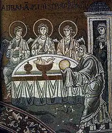 La fórmula bizantina suele presentar a los tres ángeles, de edad similar, en isocefalia, sentados a la mesa preparada con la comida, tanto en joyas como en pintura o mosaico. Más adelante, los tres ángeles ya no son similares, el del medio, realzado, representa a Dios Padre, y eleva sus alas.