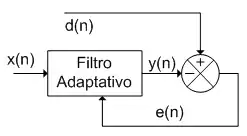 La estructura de un filtro adaptativo es un sistema al que le llegan dos señales: x(n) y e(n), esta última se llama señal de error y viene de la resta de una señal a la que se llama señal deseada, d(n), y otra que es la salida del filtro y(n). A los coeficientes del filtro se les llama w(n), que son los que multiplican a la entrada x(n) para obtener la salida.