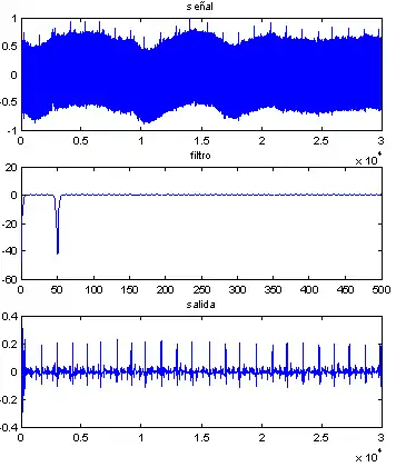 En la siguiente figura, tomada de un electrocardiograma, se muestra el aspecto de la función de transferencia del filtro en la parte central. En la parte superior, se muestra la señal que se quiere filtrar y en la parte inferior la señal ya filtrada.
