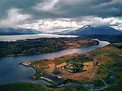 ![]() El fiordo Eberhard, con el seno Última Esperanza en el fondo y la estancia Puerto Consuelo en primer plano