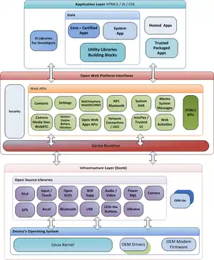La arquitectura de Firefox OS tiene tres componentes muy importantes:[40]