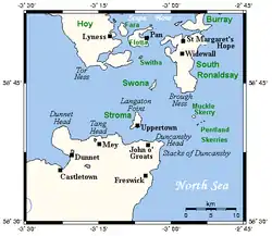 - Islas: Hoy, Pentland Skerries, Swona, South Ronaldsay, South Walls (todas generalmente consideradas parte de las Orcadas), Stroma.