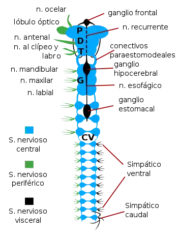 El sistema nervioso simpático o vegetativo es considerado parte del sistema periférico. Incluye neuronas que inervan al intestino, órganos endocrinos, los espiráculos del sistema traqueal y los órganos reproductores.[13]