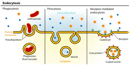 La endocitosis mediada por receptores es una forma de pinocitosis en la que una célula absorbe moléculas o solutos específicos. Las proteínas con sitios receptores se encuentran en la membrana plasmática, uniéndose a solutos específicos. Las proteínas receptoras que están unidas a los solutos específicos van dentro de fosas recubiertas, formando una vesícula. Las vesículas luego rodean los receptores que están unidos a los solutos específicos, liberando sus moléculas. Las proteínas receptoras son recicladas de regreso a la membrana plasmática por la misma vesícula.[1]