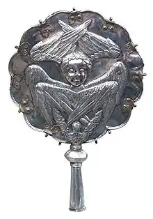 Generalmente está hecho de metal, en forma redonda y lleva la imagen iconográfica de un serafín con seis alas que rodean la cara y se sitúa en el extremo de una vara, más larga que en los flabelos latinos. También se encuentran en madera grabada, dorada o pintada. Se suelen hacer por parejas.
