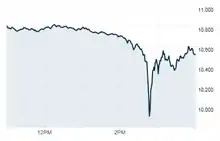 El 6 de mayo de 2010, los mercados de valores de los Estados Unidos abrieron con caídas y se mantuvieron bajistas durante la mayor parte de la jornada como consecuencia de la preocupación existente en el mercado por la crisis de deuda en Grecia. A las 14:42, cuando el índice Dow Jones acumulaba una caída de más de 300 en el día, el mercado de valores comenzó a caer rápidamente, bajando en más de 600 puntos en 5 minutos hasta alcanzar una pérdida de cerca de 1000 puntos en el día hacia las 14:47. Veinte minutos más tarde, hacia las 15:07, el mercado había recuperado la mayor parte de los 600 puntos de caída.[6]
