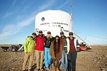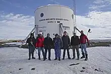 ![]() El exterior de la estación se finaliza el 26 de julio de 2000. De izquierda a derecha, Joe Amarualik, Joannie Pudluk, John Kunz, Frank Schubert, Matt Smola, Bob Nesson y Robert Zubrin. |