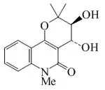 | 2′ξ-hidroxi-N-metil-1′,2′-dihidroflindersina (2,3,4,6-Tetrahidro-3-hidroxi-2,2,6-trimetil-5H-pirano[3,2-c]quinolin-5-ona) | 1′,2′-Dihidro, 2′ξ-hidroxi, N-metil | C15H17NO3 | 928008-45-1 | 259.304 | Sólido amorfo | Aislado de Skimmia laureola[20] | [α]29D = -57 (c, 0.14 en MeOH). UV: [neutro]λmax265 (log ε2.67);304 (log ε3.84);318 (log ε3.86);325 (log ε3.74);330 (log ε3.76) (MeOH) |