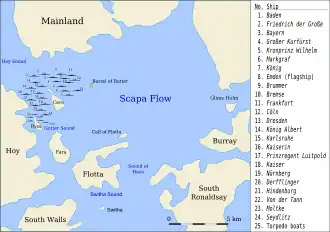 Tras la capitulación de Alemania en noviembre de 1918 la mayor parte de la Flota de Alta Mar, bajo mando del contralmirante Ludwig von Reuter, fue internada en el fondeadero británico de Scapa Flow.[81] Antes de la partida de la flota alemana el almirante Adolf von Trotha dejó claro a Reuter que no podía permitir que los Aliados se hicieran con los barcos bajo ninguna condición.[5] La flota se reunió con el crucero ligero británico Cardiff, que la lideró hasta una flota aliada que debía escoltarla a Scapa Flow. La masiva flotilla de escolta la componían unos 370 buques de guerra británicos, estadounidenses y franceses.[83] Una vez internados, los cañones de los barcos germanos fueran deshabilitados y sus tripulaciones reducidas a 200 oficiales y marineros en cada buque capital.[84]