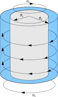 Un flujo Taylor-Couette simple es un flujo constante creado entre dos cilindros coaxiales rotativos infinitamente largos.[3] Dado que las longitudes de los cilindros son infinitamente largas, el flujo es esencialmente unidireccional en estado estable. Si el cilindro interior con radio gira a velocidad angular constante y el cilindro exterior con radio gira a velocidad angular constante como se muestra en la figura, entonces el componente de velocidad azimutal viene dado por:[4]