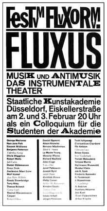 Fluxus (palabra latina que significa flujo) es un movimiento artístico de las artes visuales en especial, pero también de la música, la literatura y la danza, el cual tuvo su momento más activo entre la década de los 60 y los 70 del siglo XX. Se declaró contra el objeto artístico tradicional como mercancía y se proclamó a sí mismo como un movimiento artístico sociológico. Fluxus fue informalmente organizado en 1962 por George Maciunas (1931-1978). Este movimiento artístico tuvo expresiones en Estados Unidos, Europa y Japón.[1]