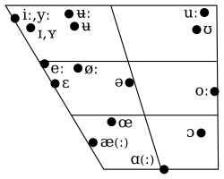 | Media | Archivo de audio "ɛ" no encontrado | eː | œ | øː | ə | ɔ | Archivo de audio "oː" no encontrado | |