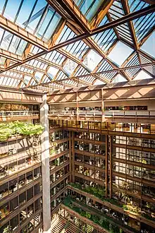 El edificio incluye 0,1 ha atrio público[2][22] con un techo de 488 m alto.[26] El jardín dentro del atrio fue diseñado por Dan Kiley, uno de los colaboradores frecuentes de Saarinen.[17][27] El jardín contiene una serie de niveles que se inclinan desde la calle 42 a la 43, con un cambio de elevación de 4 m.[20][28] Como se dispuso originalmente, el atrio tenía 18 plantas acuáticas en una piscina, 37 árboles, 148 enredaderas, 999 arbustos y 22.000 plantas de cobertura del suelo.[14][28] Kiley transportó algunas plantas de eucalipto de California con la expectativa finalmente no realizada de que crecerían 24,4 m.[22] Las plantaciones se organizaron alrededor de una fuente cuadrada ubicada en el centro.