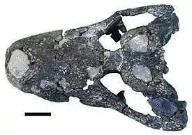 | Allodaposuchus[3] | A. precedens | Un cráneo, dientes, un osteodermo, etc. | Un alodaposúquido. | ![]() Cráneo de Allodaposuchus. |